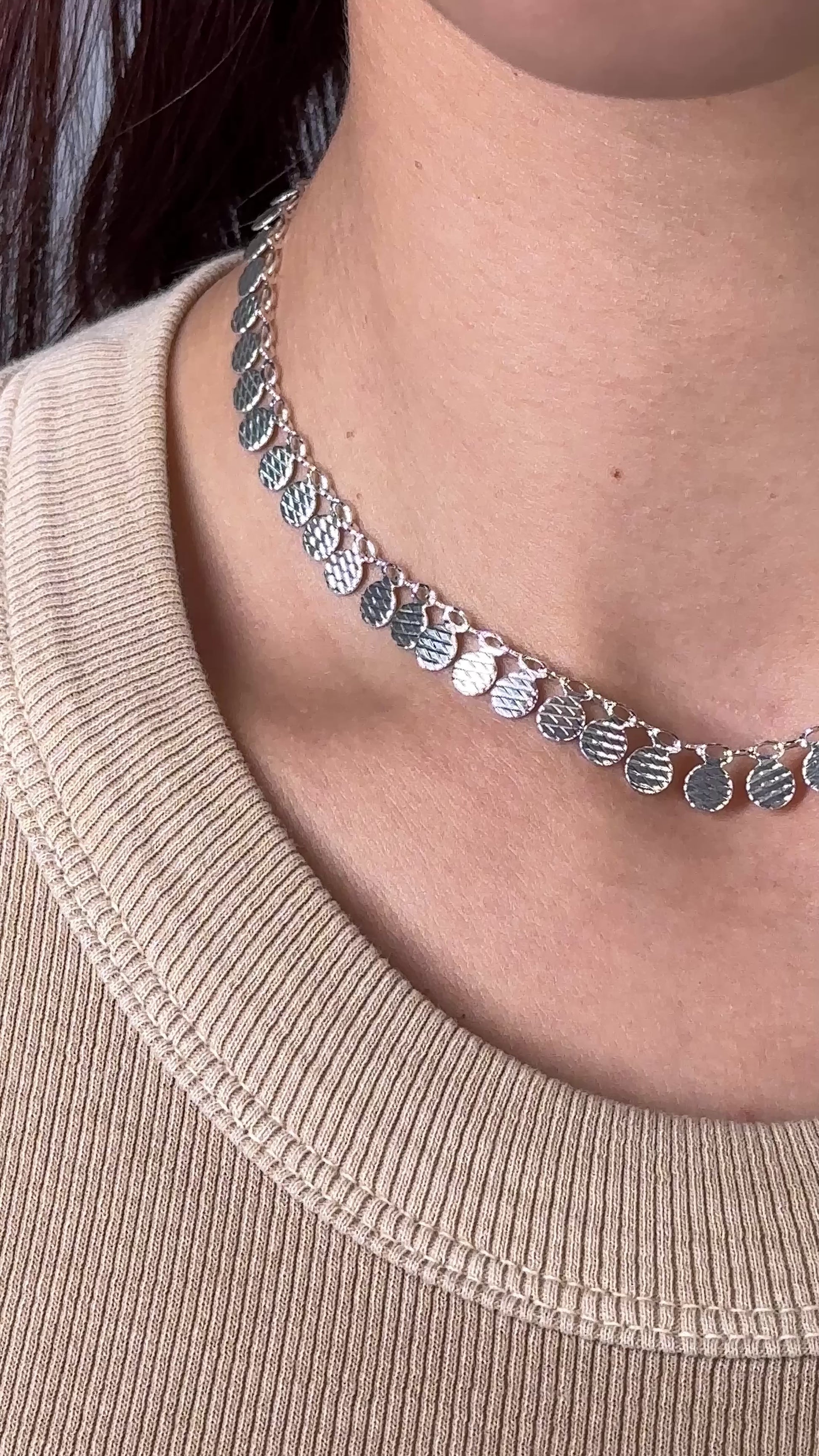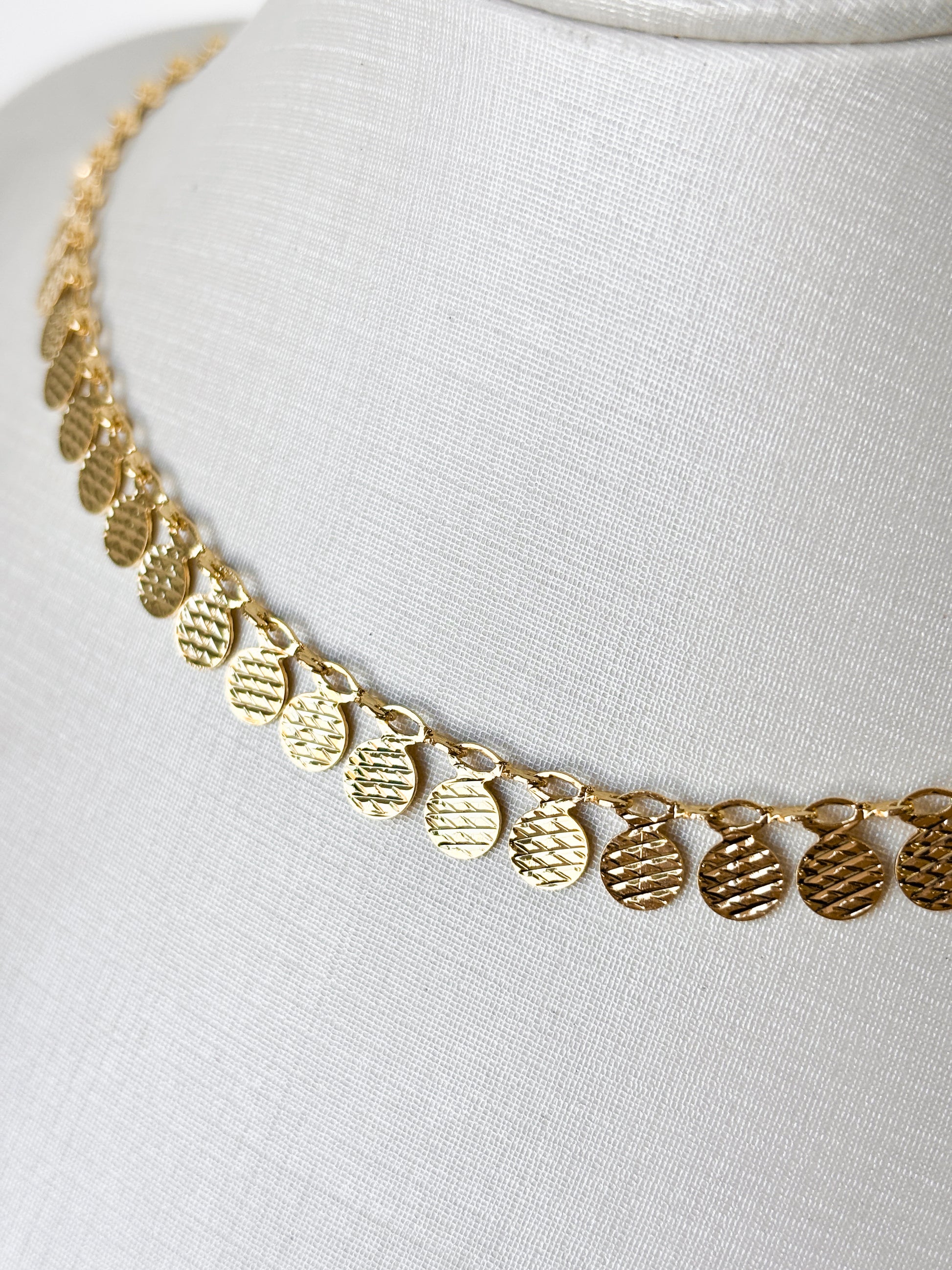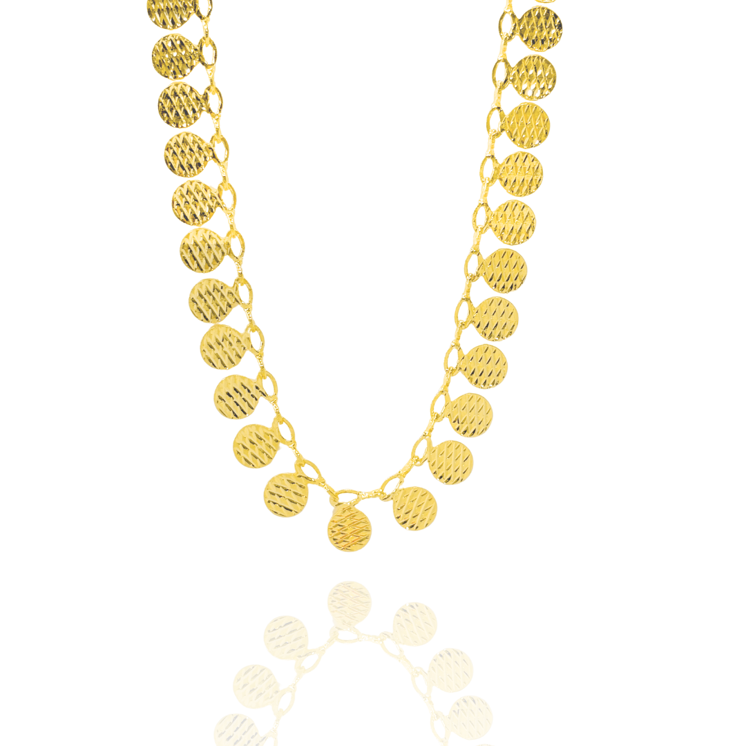 Com elos delicados e medalhinhas texturizadas que refletem a luz com charme, a Fran é aquela peça que transforma o visual sem esforço. Disponível nos banhos de ouro amarelo e prata.
