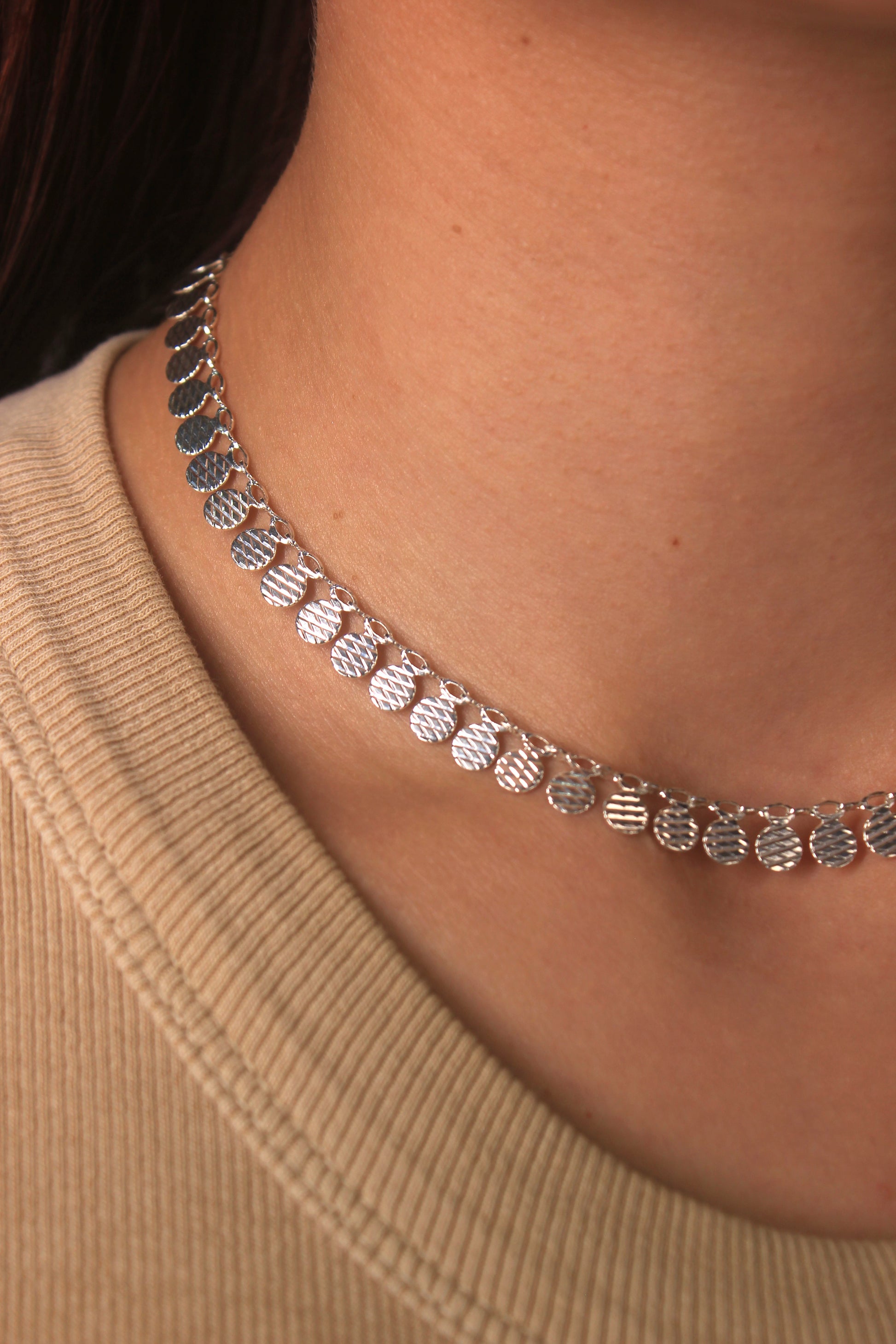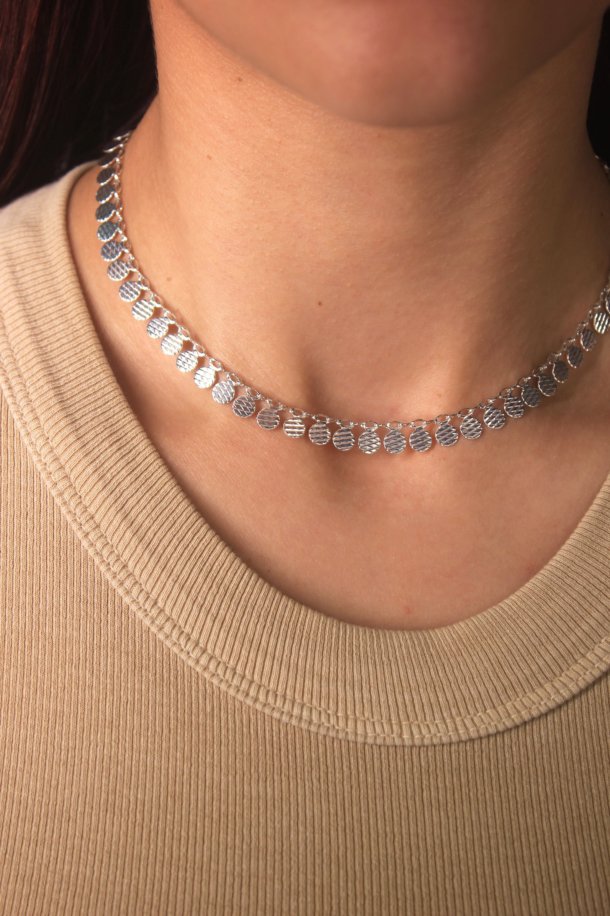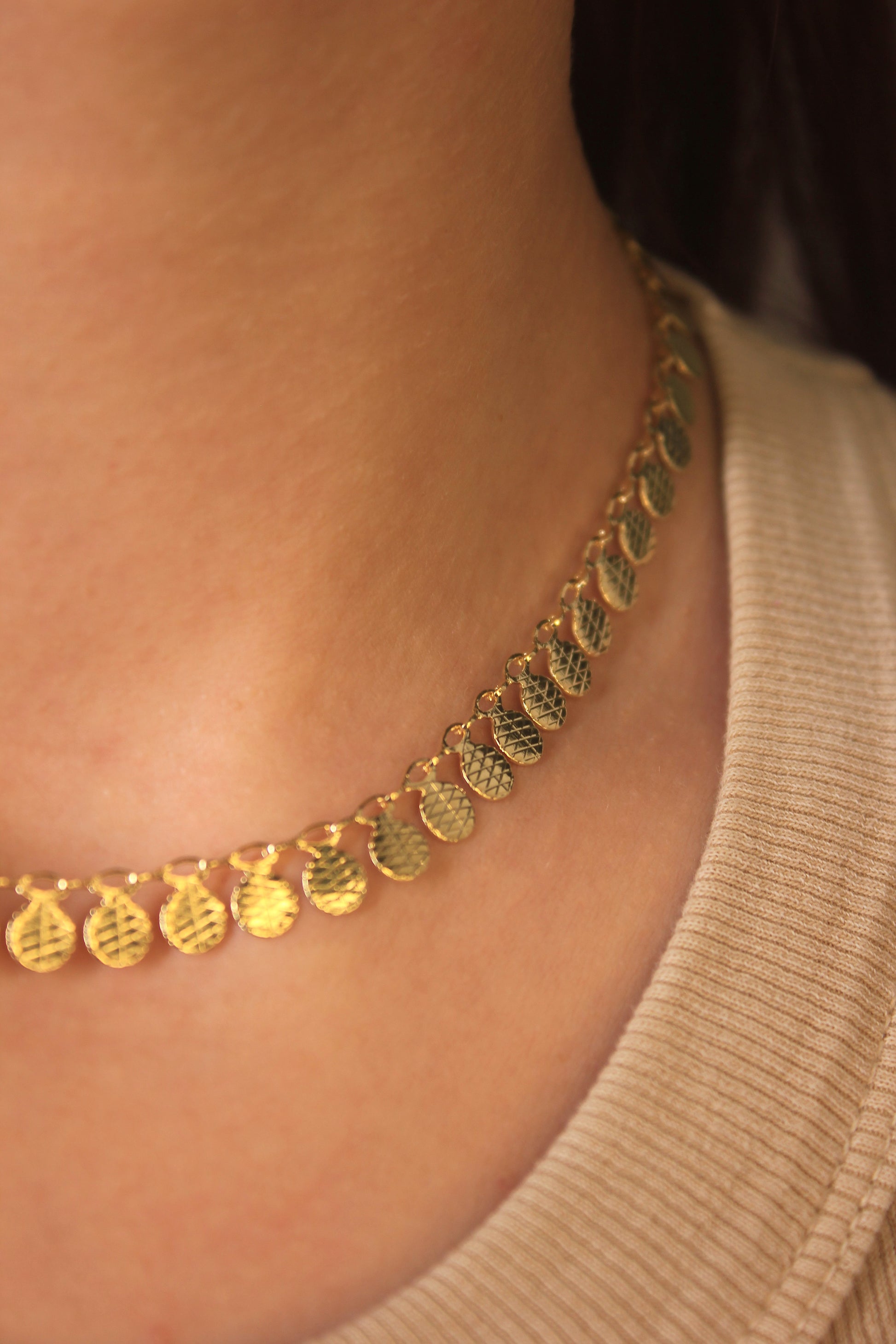 Com elos delicados e medalhinhas texturizadas que refletem a luz com charme, a Fran é aquela peça que transforma o visual sem esforço. Disponível nos banhos de ouro amarelo e prata.
