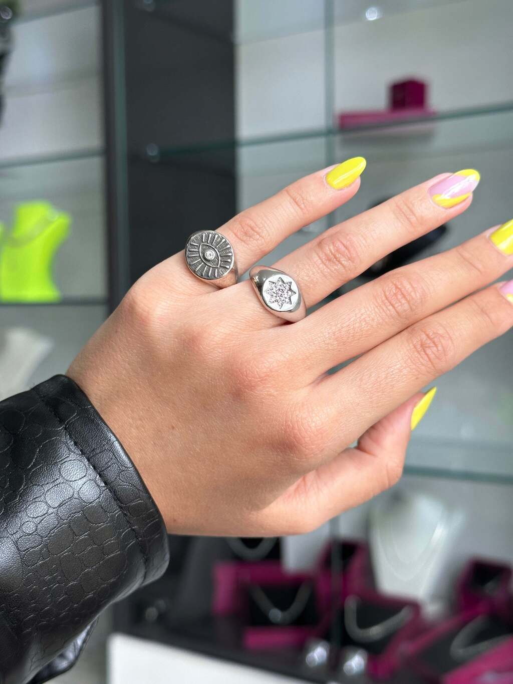 Anel em formato redondo com olho, e pedra de zircônia no centro, com acabamento liso e escovado e detalhes em prata envelhecida.